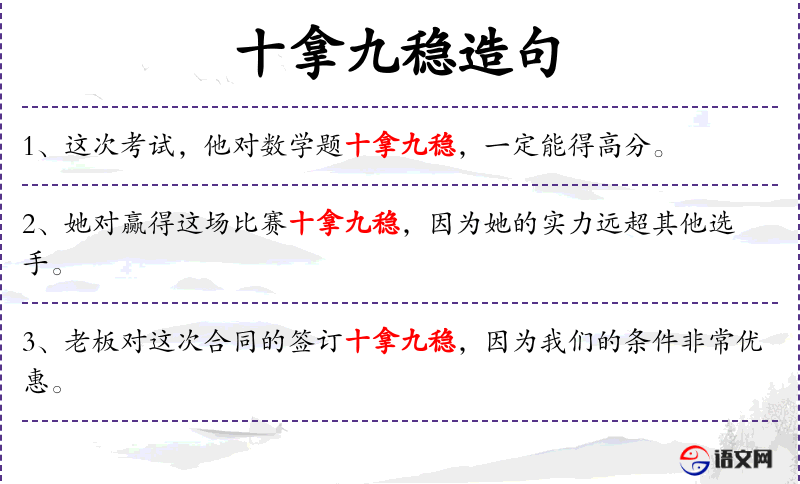 - 十拿九稳:成语,意思是十分之九的把握,形容非常有把握。