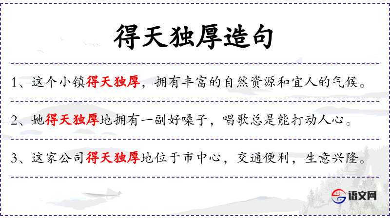 4. 【得天独厚】 天:天然,自然;厚:优厚。具备的条件特别优越,所处环境特别好。