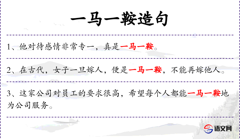 1. 【一马一鞍】 - 比喻一夫一妻,白头偕老。