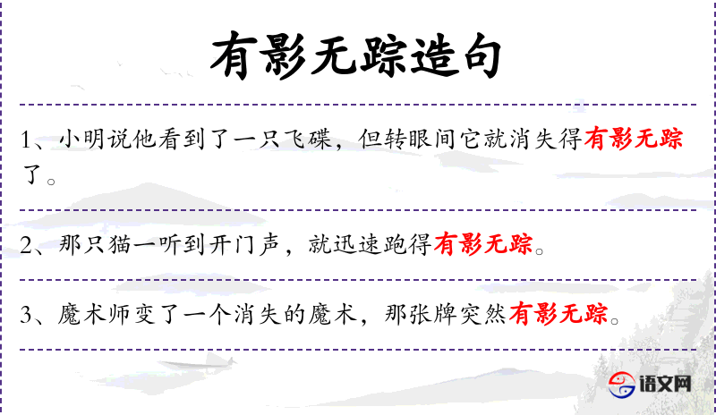1. 【有影无踪】 只有来的影子没有去的踪迹。