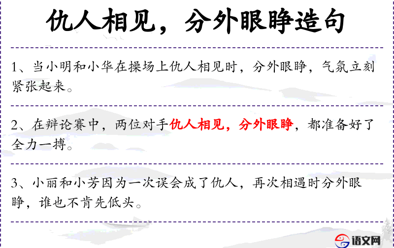 - 文化背景:在**文化中,“仇人相见,分外眼红”是一个常用成语,形容敌对双方相遇时的激烈情绪。