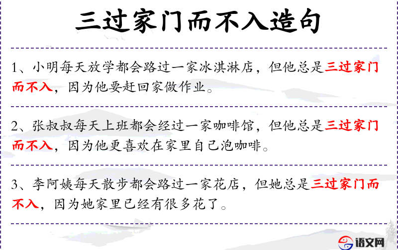 1. 【三过家门而不入】 - 指夏禹治水的故事,比喻热心工作,因公忘私。