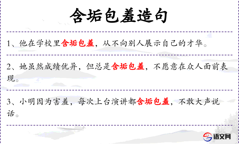 在翻译中,“含垢包羞”被翻译为“reticent”(英文)、“恥ずかしがり屋”(日文)和“schüchtern”(德文),这些词汇都传达了原句中“含垢包羞”的含义,即羞怯和不愿表达。