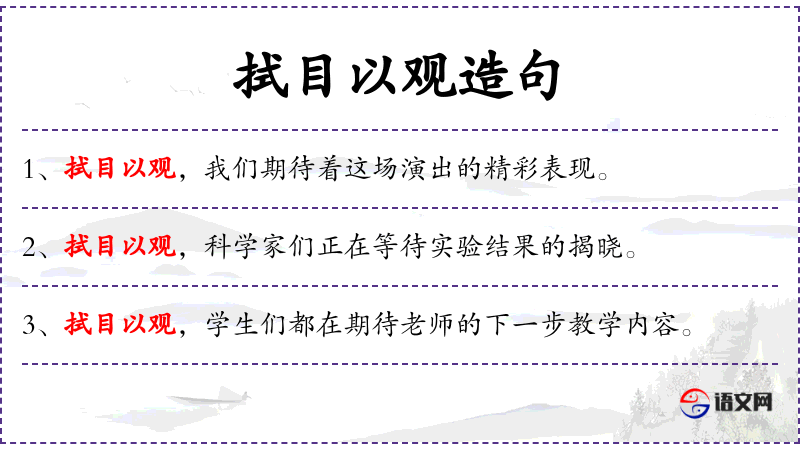 - 拭目以观:这是一个成语,意思是拭目以待,表示期待、观察的意思。