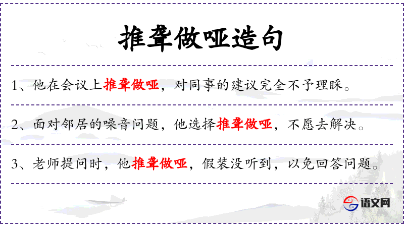 - 成语:推聋做哑是一个典型的成语,反映了汉语中丰富的表达方式。
