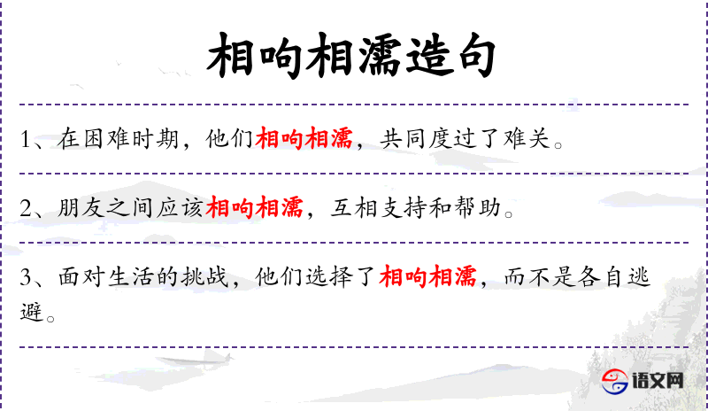 呴:吐口水;濡:沾湿。原指泉水干竭,鱼儿互相吐口水以沾湿求生。后比喻处于困境之中,互相竭力救助。