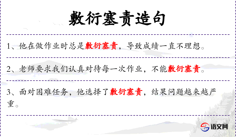 1. 【敷衍塞责】 敷衍:马虎,不认真,表面上应付;塞责:搪塞责任。指工作不认真负责,表面应付了事。