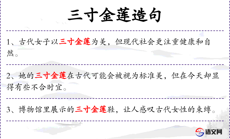 1. 【三寸金莲】 金莲:旧指女子缠过的小脚。封建时代美誉妇女小脚的用语。