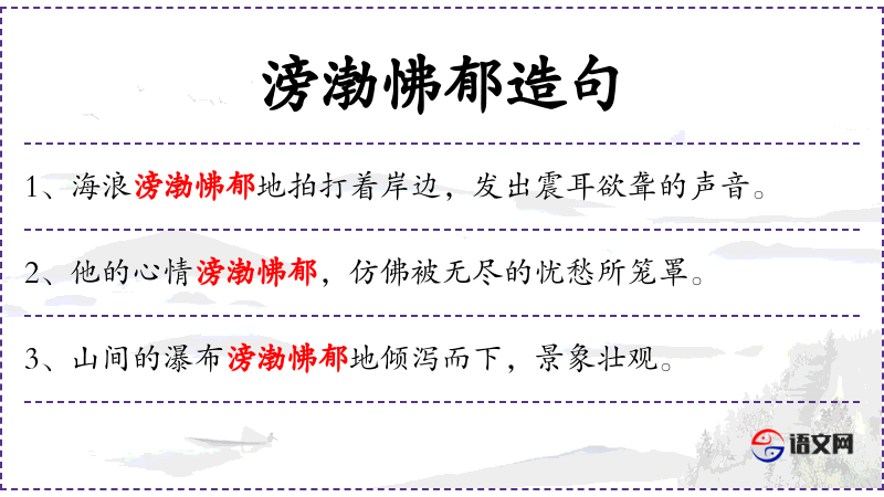 2. 【滂渤怫郁】 滂渤:水势怒激的样子;怫:形容忧愁或愤怒;怫郁:郁闷。指波涛激荡的情景。