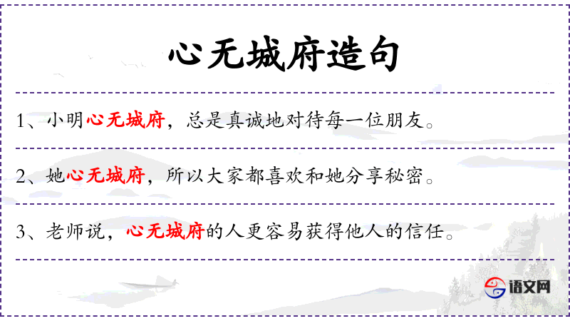 - 宾语:无明确宾语,但“心无城府”是一个形容词短语,描述主语的状态。