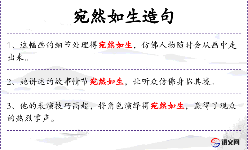 - “宛然如生”这个成语在**文化中常用来形容艺术作品或表演非常逼真,仿佛真实场景一般。
