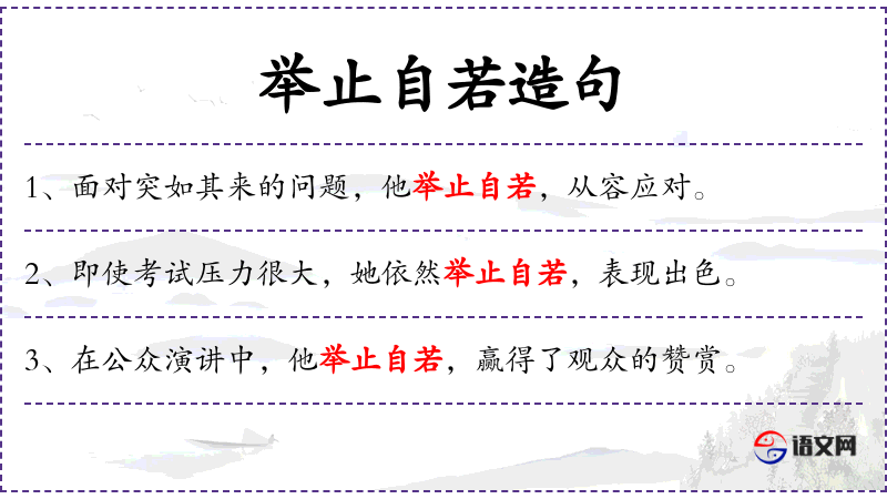 - 举止自若:行为举止保持镇定,不受外界影响。