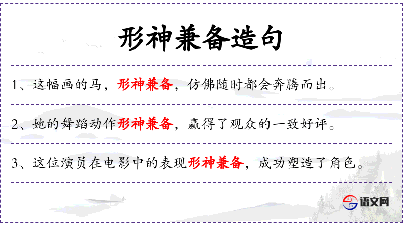 “形神兼备”是**文化中常用的成语,强调外在形式与内在精神的和谐统一。在舞蹈、书法、绘画等艺术领域,这个成语常用来评价作品的高水平。