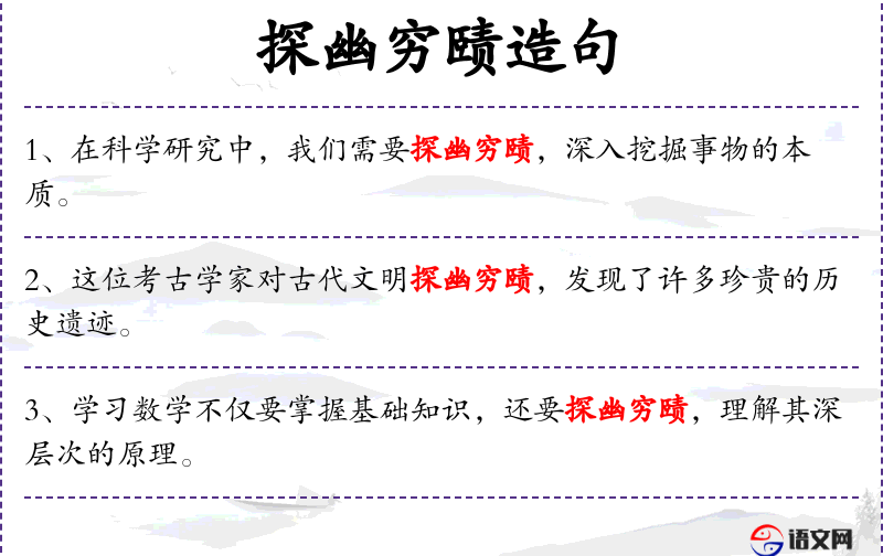 3. 【探幽穷赜】 探:寻求,探测;赜:幽深玄妙。探究深奥的道理,搜索隐秘的事情。