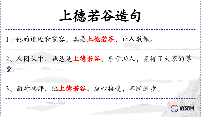 1. 【上德若谷】 - 上德:最高的道德;谷:溪谷。形容具有崇高道德的人胸怀如同山谷一样深广,可以容纳一切。