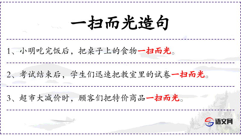 1. 【一扫而光】 一下子就扫除干净。