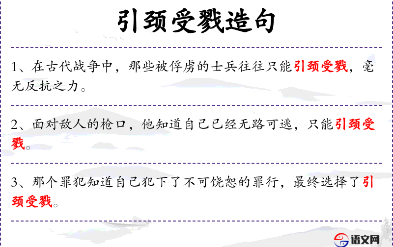 句子中的“引颈受戮”是一个具有浓厚文化色彩的成语,源自古代战争中士兵无反抗地接受死亡的情境。这个成语反映了古代战争的残酷性和士兵的无奈。