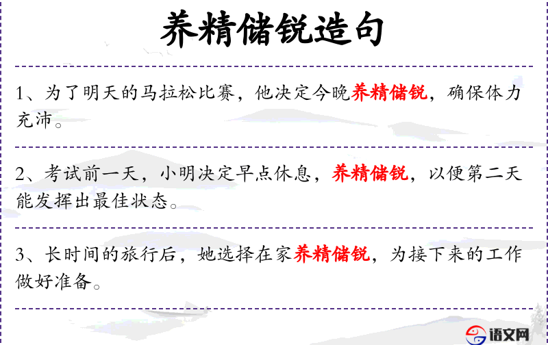 - 养精储锐:to conserve energy and sharpen one's abilities, to prepare mentally and physically