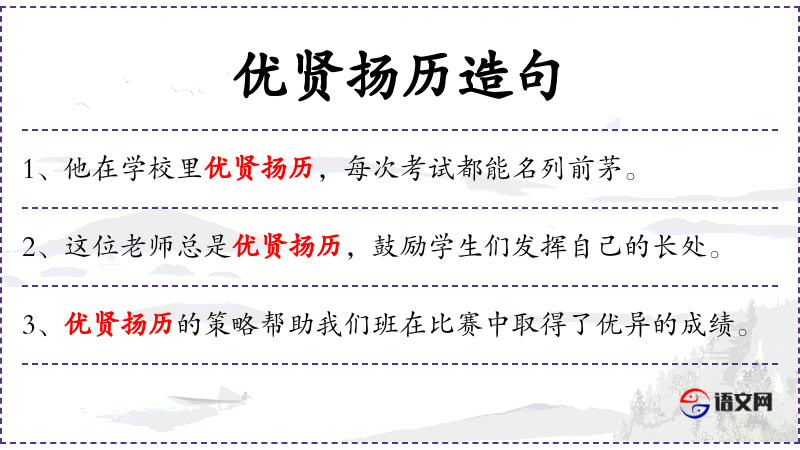 - 优贤扬历:这个词组可能是指一种选拔和提升优秀人才的方法。