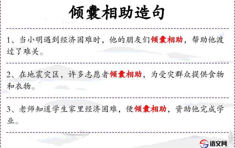 1. 【倾囊相助】 囊:口袋。把衣袋里所有的钱都拿出来帮助别人。