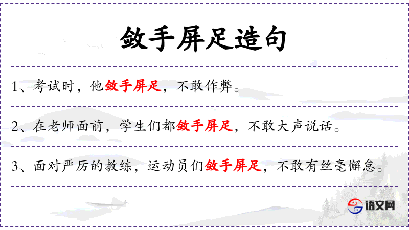 句子:“在重要的会议上,他敛手屏足,认真听取每一位发言者的意见。”