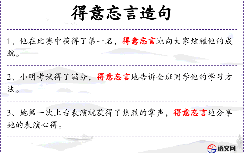 - 得意忘言:成语,表示因为得意而忘记了说话的规矩。