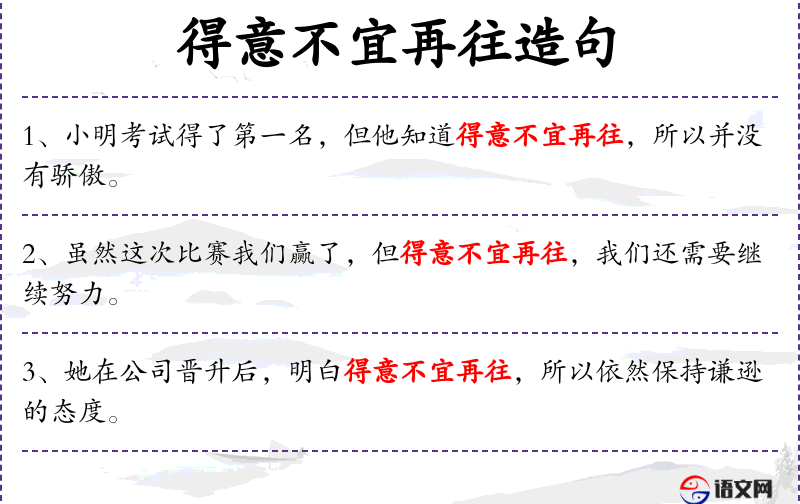 - 使用“得意不宜再往”表达了一种含蓄的劝诫,暗示小明不应过度自满。