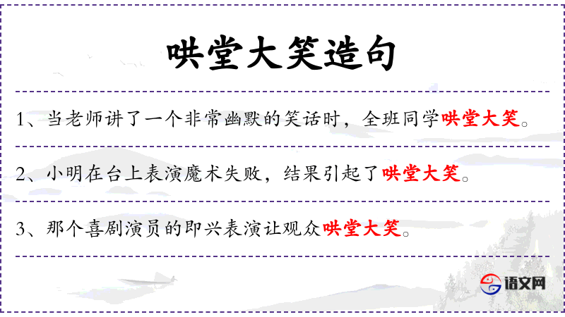 - 宾语:许多幽默元素、同学们哄堂大笑