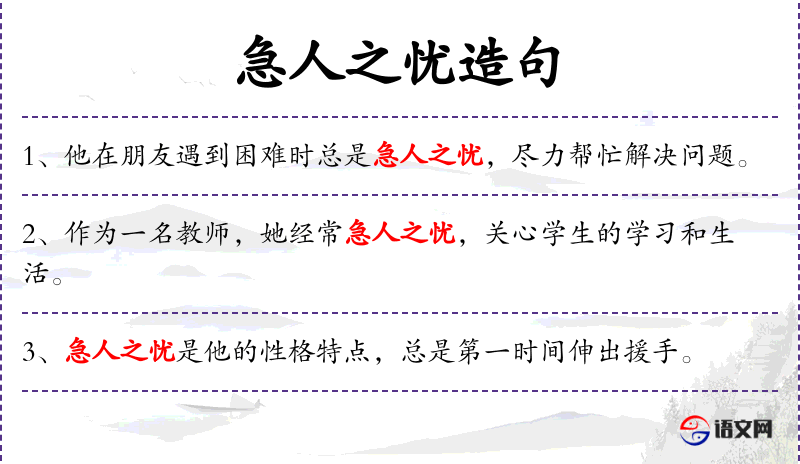 - 成语:“急人之忧”是一个常用的成语,强调了在别人困难时提供帮助的重要性。