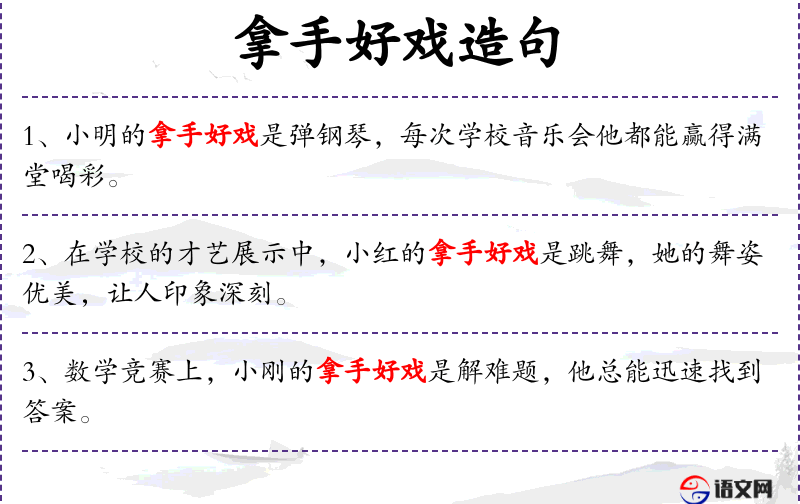 - 拿手好戏:指某人特别擅长的事情或技能。