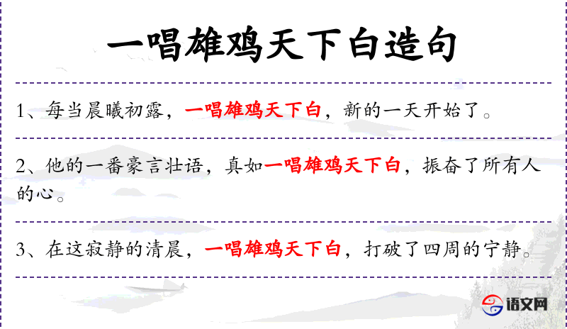 1. 【一唱雄鸡天下白】 - 公鸡一叫,天就亮了。形容东方破晓,长夜宣告结束。指真相大白