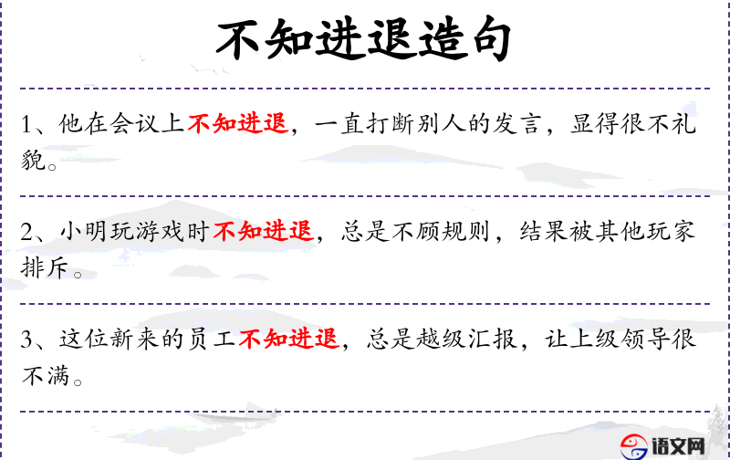 1. 【不知进退】 - 不知道应当前进还是应当后退。比喻无决断。也形容言语行动没有分寸。