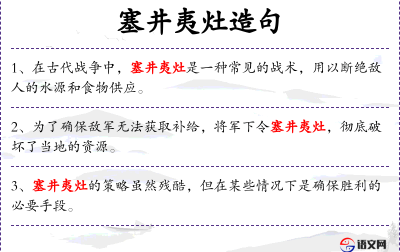 - 塞井夷灶:一种古代军事策略,意为破坏敌方的水源和炊事设施,使其无法维持正常生活和作战。