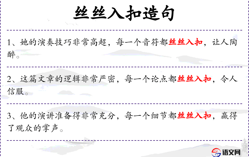 - 丝丝入扣:形容论点之间紧密相连,无懈可击。