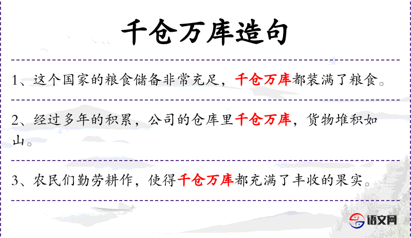 - 千仓万库:形容仓库非常多,比喻物资丰富。
