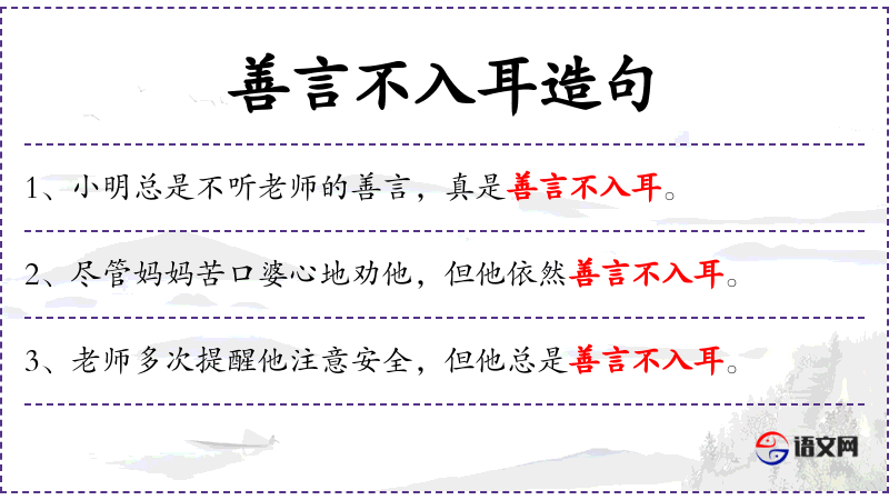 句子中“善言不入耳”是一个成语,源自*传统文化,强调好的建议应该被听取和采纳。这反映了尊重长辈和接受建议的文化俗。