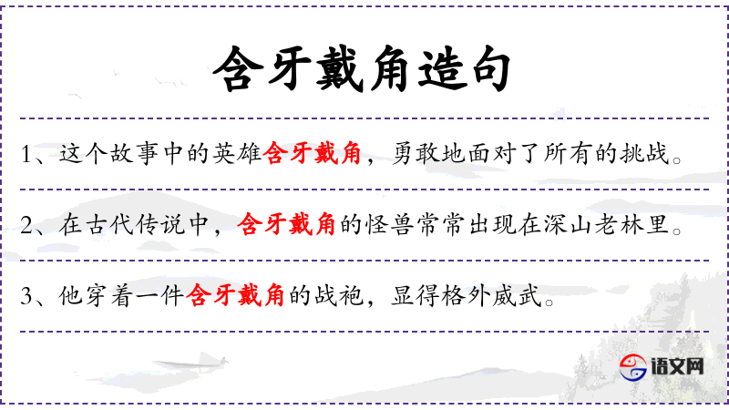 - 宾语:含牙戴角的图腾能带来力量和保护