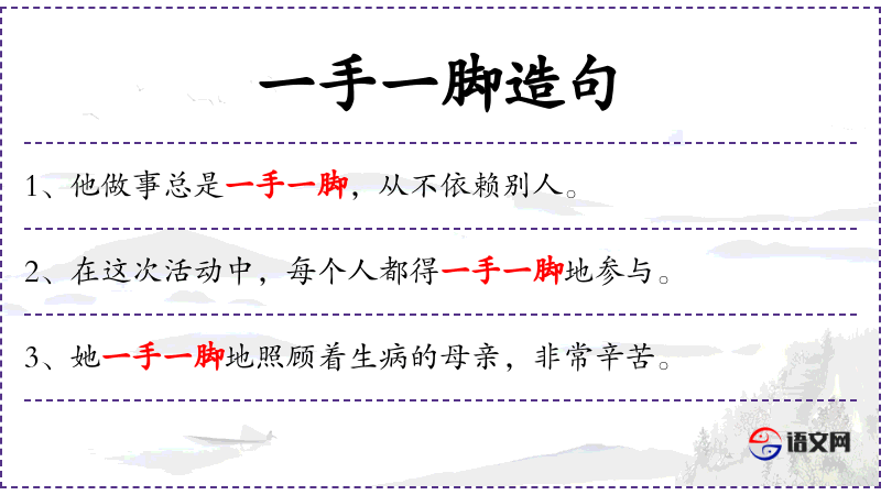 - 一手一脚地:这个短语通常用来形容做事非常认真、细致,每一个步骤都要亲自参与。