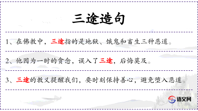 亦作"三涂"。佛教语。即火途(地狱道)﹑血途(畜生道)﹑刀途(饿鬼道); 指封建时代取得官职的三条途径举荐﹑征辟﹑科甲。