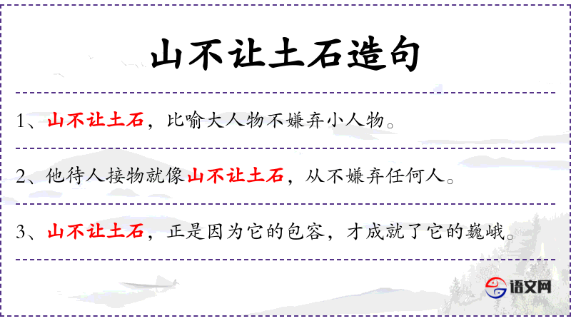 1. 【山不让土石】 山不拒辞土石才能高大。比喻人度量宽广,才能成大事。