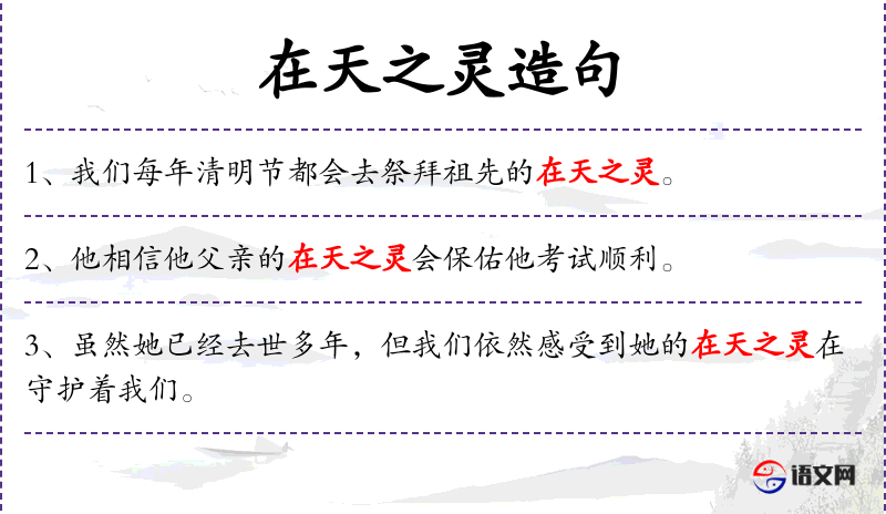 - 在天之灵:名词短语,指已故亲人的灵魂。