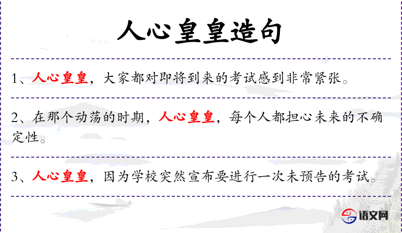 - 成语、典故:“人心皇皇”可以联想到“人心惶惶”,都是形容人们普遍恐慌的状态。