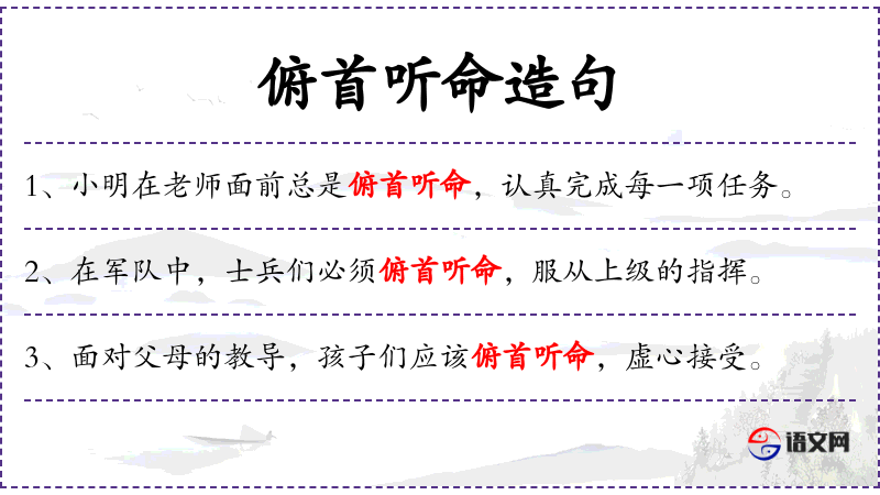 - 俯首听命:动词短语,表示服从和遵守。