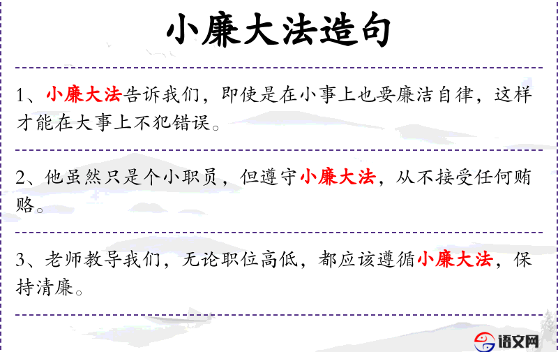 - 或者:“小廉大法教导我们,无论事情大小,都应保持廉洁自律,以免在大事上失误。”