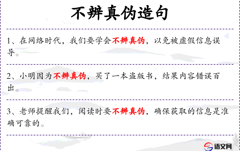 - 宾语:不辨真伪
