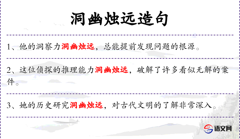 4. 【洞幽烛远】 洞:洞察;幽:深远;烛:照亮。形容目光锐利,能洞察事物幽深细微之处。