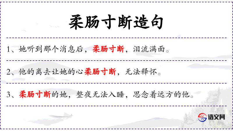 2. 【柔肠寸断】 - 柔软的心肠一寸一寸地断开。形容女子的忧愁苦闷。