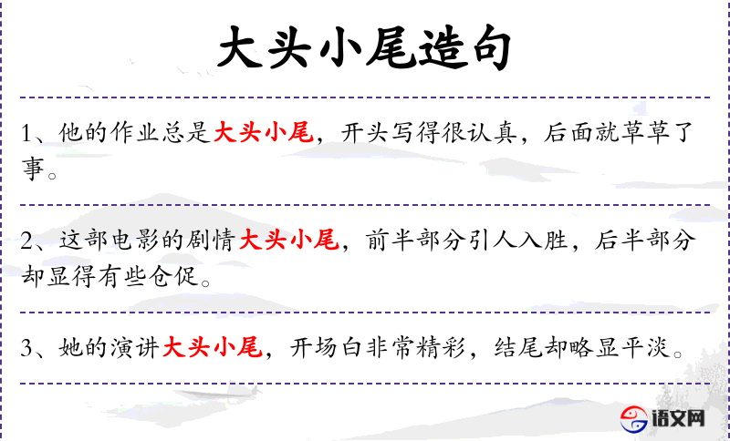 - 大头小尾:形容事情开始时气势磅礴,结束时却平平淡淡。