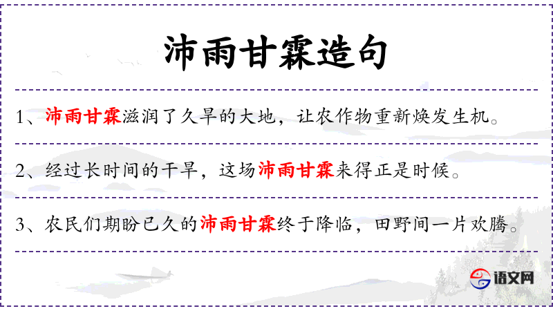 1. 【沛雨甘霖】 - 充足而甘美的雨水。比喻恩泽深厚。
