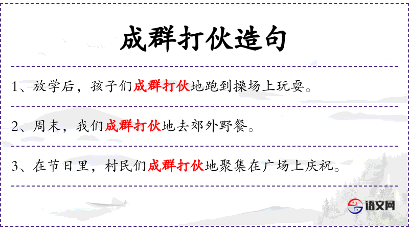 1. 【成群打伙】 指众多的人或动物聚结成一群群、一伙伙。